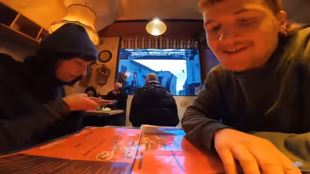 08:24:07Nachdem die Sorge um den Camber etwas verflogen ist, wird ein Restaurant in der Burg gefunden, das vegetarische Optionen anbietet. Es gibt eine Auswahl an Burgern und Salaten, wobei sich der Kommentator für einen Pizza Margherita und Patatas Bravas entscheidet, während Gül einen Burger wählt. Während des Wartens auf das Essen werden zukünftige Pläne besprochen, wie eine mögliche Deutschland-Fahrradtour und die Reparatur eines Tandems. Das Essen, insbesondere die Pizza, wird als gut und befriedigend empfunden, besonders für den Preis und den Ort.
