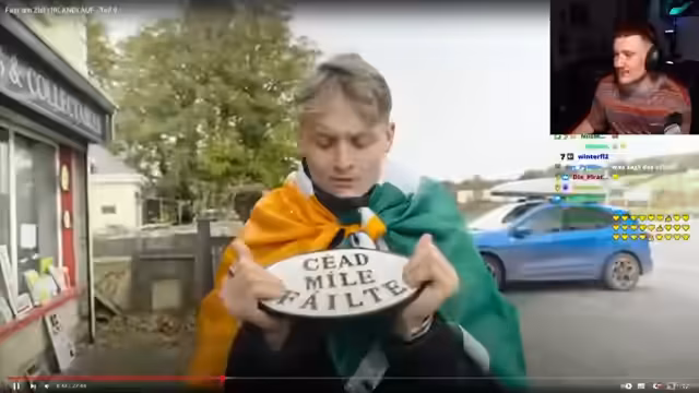 09:15:04Nachdem die Besteigung des Berges gescheitert ist, setzen die beiden ihre Reise fort und laufen Cork City entgegen. In einem Antiquitätengladen, der nach 17 Jahren schließt, erhalten sie eine irische Flagge und ein Schild mit der Aufschrift '100,000 Welkom' als Geschenke. Dies symbolisiert die Unterstützung und Gastfreundschaft der irischen Bevölkerung und dient dem Streamer als symbolisches Geschenk für das Grab seines Opas, zu dem er noch pilgern möchte.