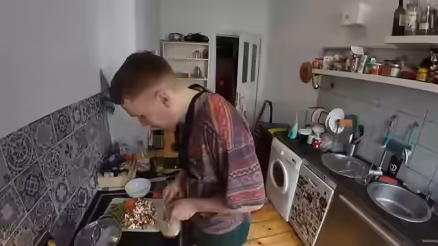 01:40:09Der Streamer beginnt mit dem Kochen eines Pfannengemüses mit Erdnuss-Chilisauce und Reis. Er liest die Anleitung vor und erklärt jeden Schritt. Dabei erwähnt er, dass er mit Hilfe von Guides wie HelloFresh kocht, ähnlich wie er es von Videospielen her kennt. Die Zutaten wie Champignons, Buschbohnen, Karotten und Frühlingszwiebeln werden vorbereitet und verarbeitet, wobei der Streamer auch humorvoll über seine mangelnde Kocherfahrung spricht.
