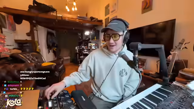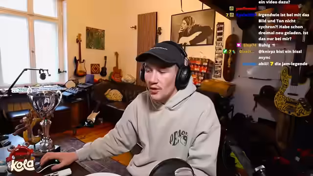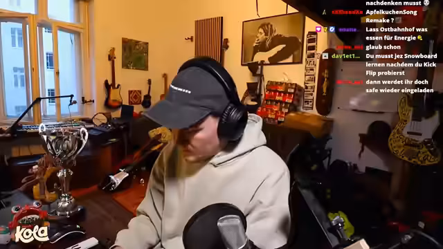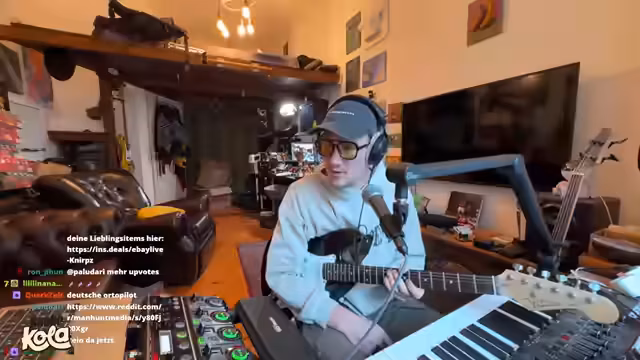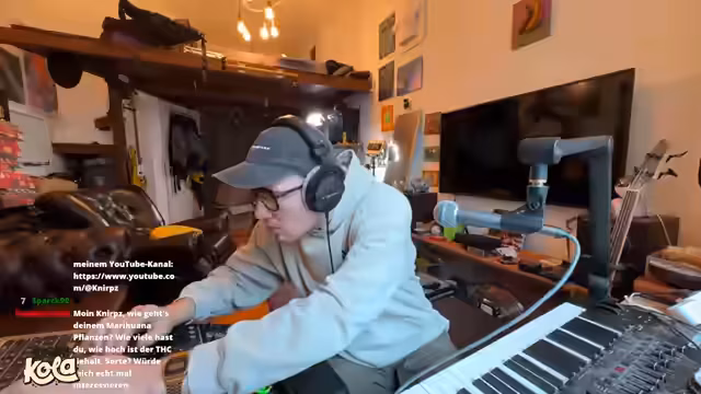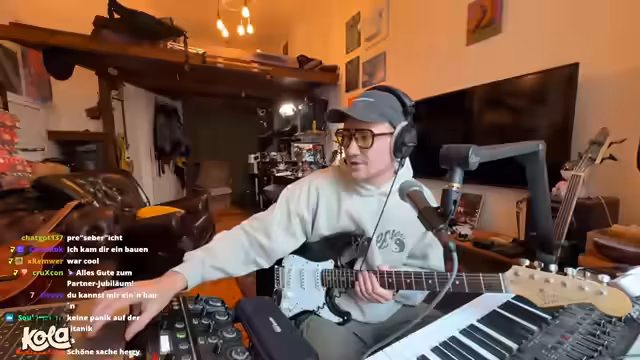 00:30:03Nach technischen Anpassungen (Tonverzögerung) startet Knirps eine Jam-Session. Er improvisiert Songs aus Zuschauereingaben (z.B. 'Kugelfisch, Baumhaus') und experimentiert mit Genres wie Techno und Drum & Bass. Dabei thematisiert er Perfektionismus: 'Ich mache mir oft selbst schlechtes Gewissen'. Später folgen Freestyle-Raps über WoW ('Karambolage') und bizarre Lama-Texte, während er die Loopstation nutzt, um Stimmungsschwankungen musikalisch auszudrücken.