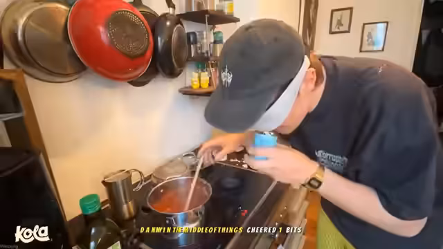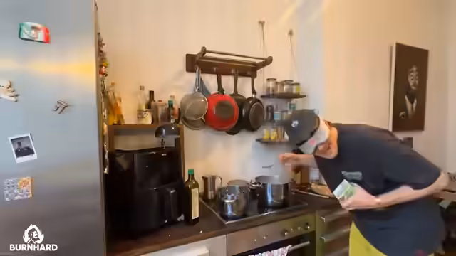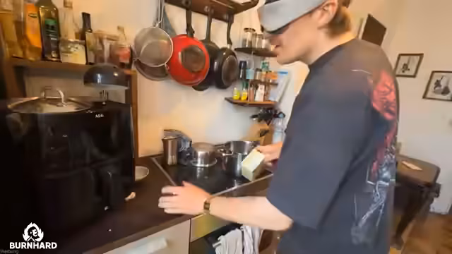 03:02:47Nachdem der Streamer die Zwiebeln und Knoblauch geschneidet hat, konzentriert er sich auf das Kochen der Nudeln. Er sucht verzweifelt nach den Nudeln, die sich schließlich in der Küche befinden. Gleichzeitig bemerkt er, dass die Zwiebeln etwas verbrennen könnten, und versucht, die Hitze zu regulieren. Der Prozess des Nudelkochens wird durch seine fehlende Orientierung und das ständige Suchen nach Utensilen erschwert.