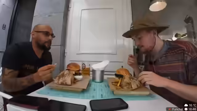 03:26:09Der Streamer und sein Begleiter gehen in einen Burgerladen auf Madeira. Der Laden wird als chillig beschrieben, es wird nach vegetarischen Optionen gefragt und die Menükarte wird präsentiert. Es werden verschiedene Burger vorgestellt, darunter ein Mushroom Burger und ein Terrific Burger, eine Herausforderung mit 500 Gramm Fleisch, die in 30 Minuten gegessen werden muss, um kostenlos zu sein.