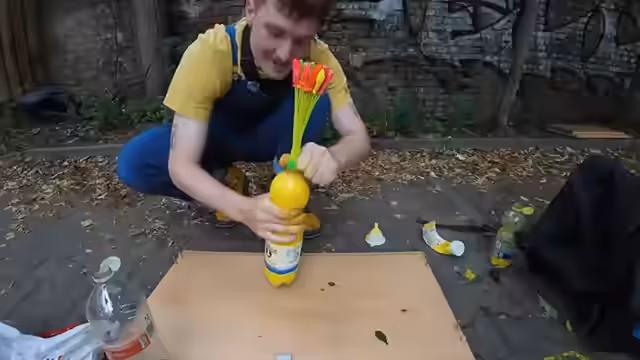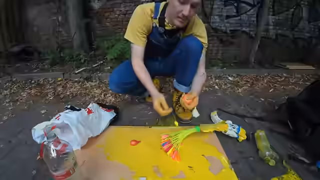 02:13:23Die Farbbomben befüllen sich, aber es spritzt daneben. Der Streamer hätte etwas unterlegen sollen. Es wird festgestellt, dass zu wenig Druck vorhanden ist. Der Streamer glaubt, dass der Deckel komplett ab sein muss. Es bleiben nur noch zwei Tage, um das Farbbomben-Experiment zum Erfolg zu führen. Der Streamer bekommt den Deckel nicht ab und fühlt sich hilflos. Er fragt den Chat um Rat, wie er die Farbe in die Farbbomben bekommen kann. Es wird die Option diskutiert, die Aktion zu Hause am Wasserhahn durchzuführen. Der Streamer wollte aber Farbe und die erste Quest war, Farbe zu finden. Die Option, einzeln zu befüllen, wird als nicht akzeptabel angesehen. Der Streamer will etwas Spitzes, um den blauen Plastikring abzumachen. Er will nicht mit dem Mund an die Farbe kommen. Seine Hände haben keinen Grip. Es wird vorgeschlagen, Farbe in die Luftballons zu füllen und diese dann mit Wasserknoten zu verschließen. Der Streamer wollte aber alle gleichzeitig befüllen.