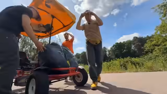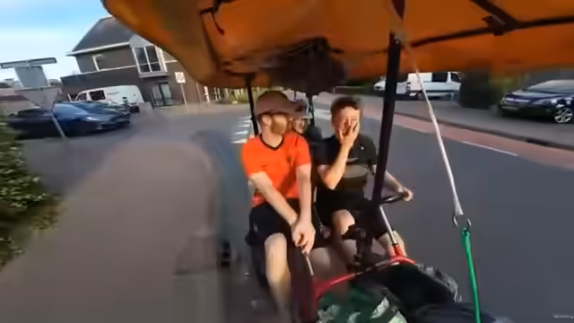 06:17:26Die Gruppe plant, 300 Kilometer mit ihrem Kettcar zurückzulegen, wobei sie flexibel bleiben und unterwegs übernachten können, ohne feste Buchungen gemacht zu haben. Sie erkennen jedoch, dass sie bei einer Durchschnittsgeschwindigkeit von über 9 km/h ohne Pausen fahren müssten, was unmöglich erscheint. Stattdessen entscheiden sie sich für eine chilligere Route und erwägen, durch Amsterdam zu fahren.