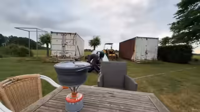 10:23:59Die Gruppe richtet sich im Garten von Erik ein und bereitet ihr Abendessen zu. Sie haben Nudeln dabei und kochen sie an einem einfachen Herd. Erik zeigt sich gastfreundlich und gibt ihnen sogar Wasser zum Kochen und Trinken. Die Gruppe freut sich über die Gemütlichkeit und die freundliche Aufnahme. Sie unterhalten sich mit Erik über ihre Reise und die Strecke, die sie noch zurücklegen müssen.