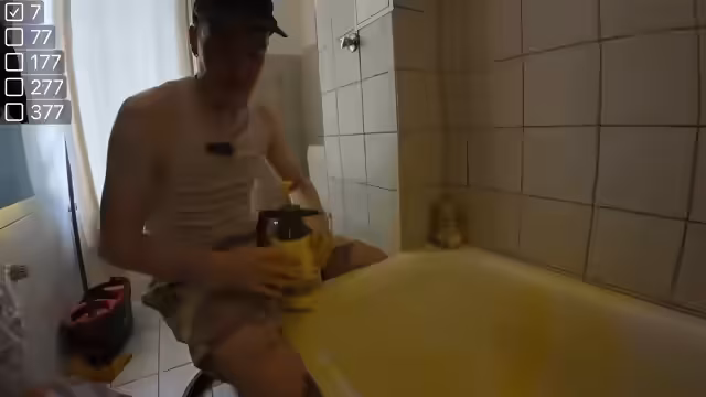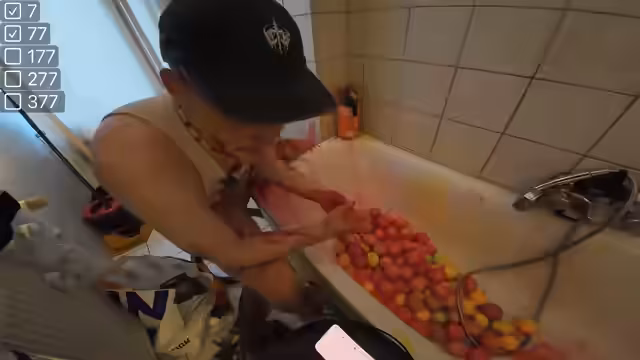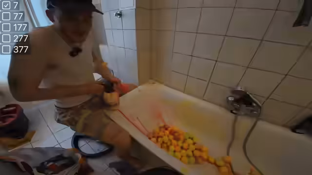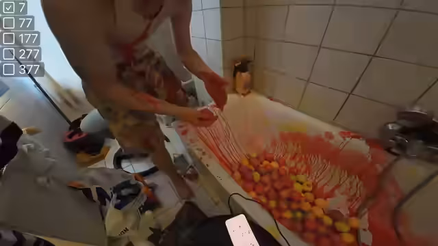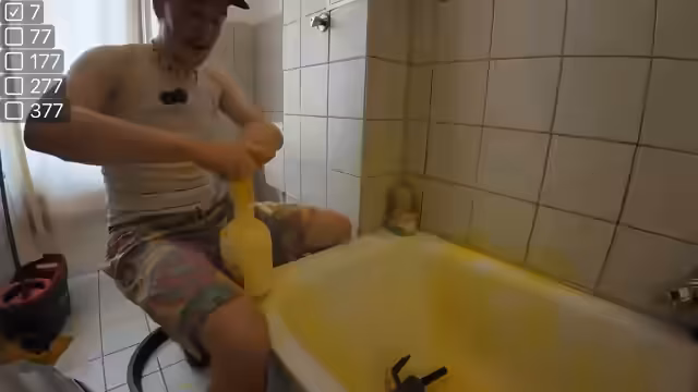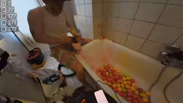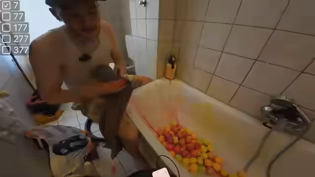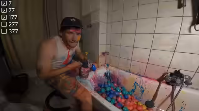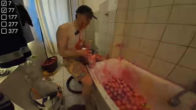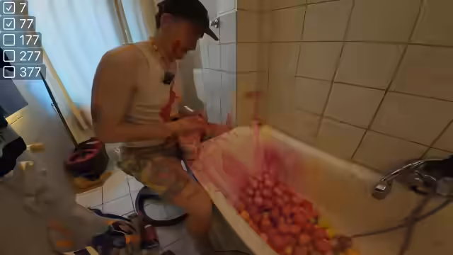 08:37:32Der Streamer kündigt an, dass der Stream morgen ab 12 Uhr startet. Er beginnt, die Farbreste und Plastikreste aus der Badewanne zu entfernen. Es wird festgestellt, dass sich eine Schlotze in der Wanne befindet. Der Streamer reinigt die Badewanne mit heißem Wasser, wobei er feststellt, dass es so 'naja' funktioniert. Er erwähnt, dass 277 Farbbomben abgehakt werden müssen und bedankt sich für die Unterstützung im Chat. Der Streamer überlegt, welche Reinigungsmittel er am besten verwenden soll, um die Badewanne sauber zu bekommen. Er probiert verschiedene Reiniger aus, darunter Scheuermilch, Isopropanol und Schimmelentferner. Es wird überlegt, ob man einen Cleaning Simulator streamen könnte. Der Streamer bedankt sich bei den Zuschauern, die um 23 Uhr dabei sind, um die Badewanne sauber zu machen.