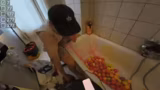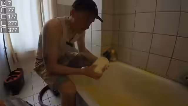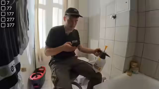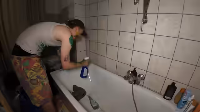 08:38:31Nachdem die Farbbomben fertig sind, beginnt der Streamer mit der gründlichen Reinigung der Badewanne, in der er gearbeitet hat. Er verwendet verschiedene Reinigungsmittel wie Scheuermilch, Aktivchlor-Schimmelentferner und Citrusreiniger, um die Farbreste zu entfernen. Trotz einiger hartnäckiger Flecken ist er mit dem Ergebnis zufrieden und die Badewanne ist sauberer als zuvor.