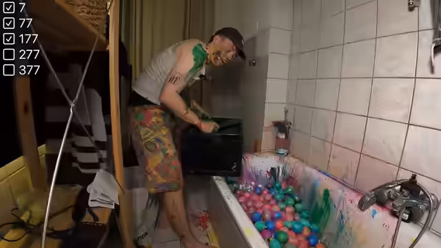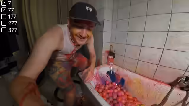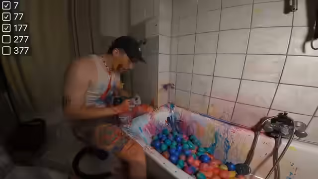 01:34:40Der Streamer fuerte mit der Produktion der Farbbomben fort und erreichte bereits die 25. Bombe. Währenddessen diskutierte er im Chat über mögliche Spiele für einen zweiten Gaming-Kanal und erwähnte seine Vorliebe für Roguelite-Games und Indie-Spiele. Auch die technische Beschaffenheit der Acrylfarbe wurde erläutert, die als schwer entfernbar gelten sollte. Gleichzeitig äußerte der Streamer Bedenken zur Reinigung der Badewanne nach dem Projekt.