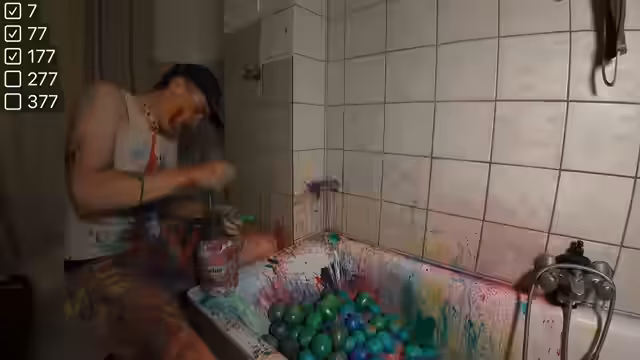 01:52:07Die Produktion der Farbbomben wird fortgesetzt, wobei über die Sauberkeit des Arbeitsplatzes und die verschiedenen Farben diskutiert wird. Es wird überlegt, welche Farbe als nächstes verwendet werden soll, wobei Rot favorisiert wird. Es wird ein Aufruf zur Abstimmung im Chat gestartet, um die nächste Farbe zu bestimmen. Die letzte gelbe Farbtube wird aufgebraucht und die Flasche wird gereinigt. Es wird über die richtige Füllmenge der Farbbomben diskutiert und es wird festgestellt, dass einige der Bomben zu prall gefüllt sind. Es wird ein neuer Versuch gestartet, einen Speedrun im Farbbombenbefüllen zu absolvieren. Es wird über die Haltbarkeit der Farbbomben und die Möglichkeit des Platzens diskutiert. Es wird überlegt, wie die Badewanne nach der Farbbombenproduktion wieder sauber gemacht werden kann. Es wird über die Lieblingsfarben der Zuschauer diskutiert. Es wird die Frage aufgeworfen, ob die Farbbomben zu klein sind und nicht richtig platschen. Es wird überlegt, ob die Farbbomben nicht so voll gemacht werden sollten. Es wird die perfekte Größe für eine Farbbombe gefunden. Es wird über die Interpretation der Farbbombenproduktion als Performance diskutiert.