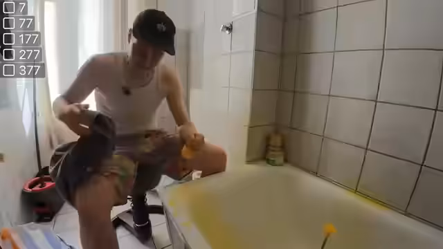 00:13:18Nach technischen Problemen und einer kurzen Pause wurde die eigentliche Arbeit aufgenommen. Der Streamer begann mit der Vorbereitung der Farben im Badezimmer und zeigte, wie er die Farbtuben in die Sprüher füllte. Es wurden Überlegungen zur richtigen Füllmenge und zur Reihenfolge der Farben (von hell nach dunkel) angestellt, um Verunreinigungen zu vermeiden. Der Streamer startete mit der gelben Farbe und versuchte, die erste Farbbombe zu befüllen und zu verschließen.
