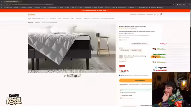 04:44:19Der Streamer kündigt seine neue Partnerschaft mit Emma Matratzen an und bewirbt diese ausführlich. Er erklärt, dass Zuschauer den Befehl '!Emma' im Chat eingeben können, um die Website des Partners zu besuchen. Er hebt die Bedeutung von gutem Schlaf hervor und stellt verschiedene Produkte von Emma vor, darunter Matratzenmodelle wie die Emma Original Pro, Emma Elite 27 Airgrid und Emma Premium 25 Hybrid Matratze. Er diskutiert die Vor- und Nachteile von weichen und harten Matratzen und erwähnt spezielle Technologien wie Memory Foam und Airgrid-Schichten. Neben Matratzen werden auch Topper, Kopfkissen, Betten, Bettwäsche, Bettdecken und Kindermatratzen angeboten. Besonders interessiert zeigt er sich an einer Premium-Gewichtsdecke, die bei unruhigem Schlaf helfen soll. Die Black Friday Deals mit bis zu 50% Rabatt und zusätzliche Vorteile wie 10 Jahre Garantie, kostenlose Lieferung und Rückversand sowie eine 100-Nächte-Geld-zurück-Garantie werden hervorgehoben. Es gibt auch eine 0%-Finanzierungsoption für Bestellungen ab 100 Euro. Mit dem Code KNIRPS können Zuschauer zusätzlich 5% sparen.