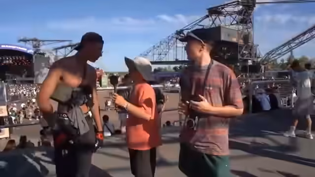 03:03:54Nachdem sie am Eingang der Mainstage angekommen sind, führen sie ein Live-Interview mit einem Rapper namens Ruttgar, der auf der 'EGA'-Bühne auf Tour ist. Er stellt seine Rap-Musik und seinen Instagram-Kanal 'Ruttgar Rollt' vor. Der Streamer betont den besonderen Vibe des Festivals und die gute Stimmung, bevor er sich auf die finale Ankündigung des Werbevideos vorbereitet, das nun in wenigen Minuten auf der großen Leinwand gezeigt wird.