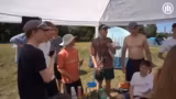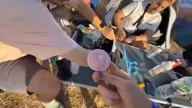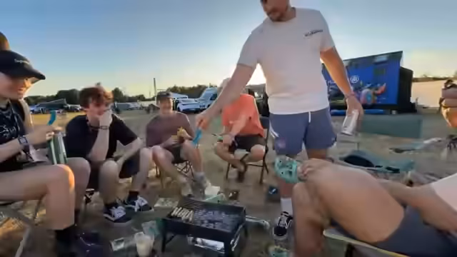 01:20:49Die Gruppe beginnt unter Zeitdruck, da der Clip bis 17:40 Uhr fertig sein muss. Ein passender Drehort zwischen den Zelten wird ausgewählt. Da kein offizieller Ball vorhanden ist, wird eine halb gefüllte Flasche als improvisiertes Ziel genutzt und jedem Darsteller wird ein Becher für die Teilnahme ausgehändigt. Die Szene wird schnell geplant und die Schauspieler auf ihre Rollen vorbereitet.