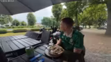 01:36:57Nach etwa 27 Kilometern und einer Pause wird Berlin verlassen und Brandenburg erreicht. In dieser Phase gibt es technische Herausforderungen, da die Reichweite des Routers an seine Grenzen stößt und die Akkus der Kameras schnell leer gehen. Trotzdem werden erste positive Erfahrungen mit der Solarenergie gemacht; das Solarpanel liefert auch im Schatten 8 Watt und in der Sonne bis zu 20 Watt, was als sehr effektiv angesehen wird. Die kurze Pause in einer Eisdiele dient der Erholung und dem Check der Technik, bevor die Tour fortgesetzt wird.