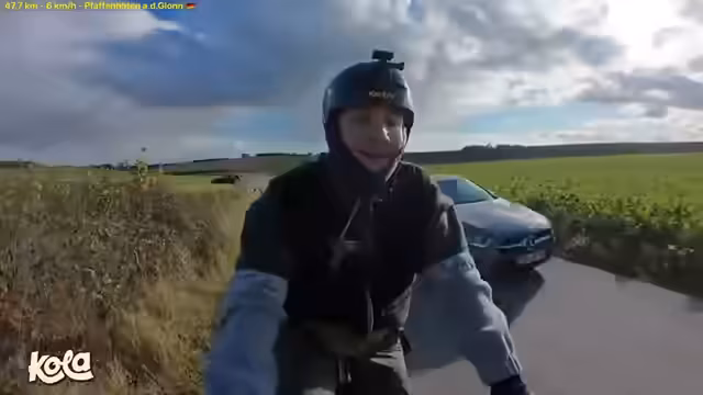 00:02:08Während der Fahrt kommt es zu einem gefährlichen Zwischenfall: Der Streamer beschreibt, wie ein hoher Bordstein von etwa 40 cm Höhe zu einem heftigen Aufprall führt, der so laut ist, dass er an explodierende Reifen denkt. Er schildert die Situation, bei der Ronny das Lenkrad verlor und in Schlangenlinien steuerte, bevor der Aufprall erfolgte. Trotz des Schocks heulen beide Fahrer, die auf einem Vierrad-Sitzer (ursprünglich für sechs Personen gedacht) saßen, mit einem Adrenalin-Schub weiter. Der Streamer betont, dass niemand verletzt wurde, aber die Sicherheitsdrohne wurde während der Fahrt zwischen Kurven aktiviert.