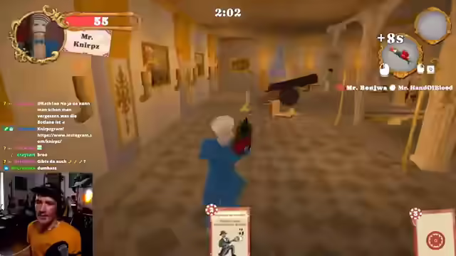 02:12:07Der Streamer holt sich den Joker und versucht, die Runde zu gewinnen. Er wird von seinen eigenen Teammitgliedern angegriffen. Er wird immer wieder beschossen und stirbt. Er beschwert sich darüber, dass er immer Damage bekommt. Er wird vom Schiff unter Arm geholt und hat wieder ein Fahrrad. Er wird von einem Auto überfahren. Er wird von der einen in die andere Kanone geschossen. Er wird durch die Gegend geschossen. Er kann nicht mal aufstehen. Er wird von einem Auto überfahren. Er wird von seinen eigenen Teammitgliedern beschossen. Er stirbt und wird als Bastard beschimpft. Sein Team gewinnt. Es steht 1 zu 1. Es werden Karten ausgewählt und gestapelt. Es kommt zu einem Kanonenduell. Der Streamer wird von allen angegriffen und braucht Hilfe. Er wird in die Hicke geschickt. Er holt einen Kill. Er wird abgeholt und eingetütelt. Es ist reizüberflutend und die Maps sind zu klein. Der Streamer hat Guides gelesen und ist jetzt drin. Er fordert seine Teammitglieder auf, zusammenzubleiben. Er wird von seinen eigenen Teammitgliedern angegriffen. Er steckt seinen Kopf in die Kanone. Er braucht Hilfe. Es kommt zu einem Kanonenduell. Er schießt mit einer Kanone vier Kugeln. Er hat eine extra Kanone. Er beschützt Leon in der Kanone. Er wird in seine eigene Kanone geballert. Er wird von einem Auto überfahren.
