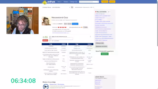 06:43:36Nach der GeoGuessr-Runde möchte der Streamer die nächsten Aktivitäten mit den Zuschauern abstimmen. Er schlägt verschiedene Optionen vor, wie Mapmaking, Watch the Music, Quizzes oder NMPZ-Prec. Eine Pizza wird in den Ofen geschoben, was zu einer kurzen Pause führt. In der Zwischenzeit beginnen sie mit Jetpunk-Quizzes, wie Länderflaggen-Umriss oder Französische Begriffe im Deutschen. Die Zuschauer sind aktiv beteiligt und stellen Fragen, was zu einem interaktiven Erlebnis führt.
