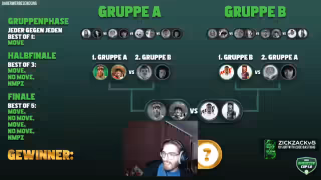 05:36:05Der Stream fängt mit einer Rückschau auf die Gruppenphase des Turniers an. Es wurden die Paarungen für das Halbfinale bekannt gegeben: Sydney und Willi aus Gruppe B treten gegen Wichtiger und Hugo aus Gruppe A an. Eine bedeutende Ankündigung war die Preisgeldverteilung. Die Halbfinalisten erhalten mindestens 1.000 Euro, der Zweitplatzierte im Finale 2.000 Euro und der Sieger einen Hauptgewinn von 10.000 Euro sowie einen Asus ROG Flow Z13 Notebook. Asus wird als Partner genannt.