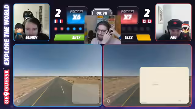 06:02:41Das Spiel bleibt bis ins Finale hinein extrem knapp und von kleinen Abständen geprägt. Beide Teams kämpfen sich Multis, wobei Team Blau langsam aufholt und das Leben ausgleicht. Es kommt zu mehreren enge Duellen, bei denen Teams auf sehr ähnliche Orte tippen und sich nur durch wenige Meter Schaden unterscheiden. Spieler wie Noxy und Blinky erkennen oft als Erste den Ort, während Team Blau teils unkonzentriert wirkt und 5Ks durch Fehler verpasst.