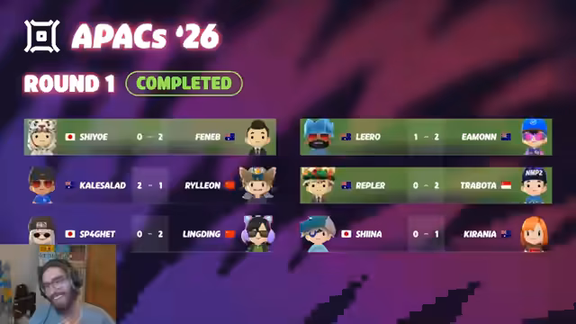 01:52:17Das Spiel zwischen Fener und Kale endet 2-0 für Kale, der durch gute Gäste und konstanten Druck einen klaren Vorteil hat. Anschließend wird das hochkarätige Duell zwischen Lingding und Eamon erwartet, wobei Eamon als Turnierfavorit gilt. Währenddessen wird das Ergebnis aus der Runde 1 bekanntgegeben, in dem Kiranya unerwartet mit 2-0 gegen China gewinnt. Streaming-Probleme führen zu Verspätungen und bieten nur ein einziges, nicht auswählbares Spiel.
