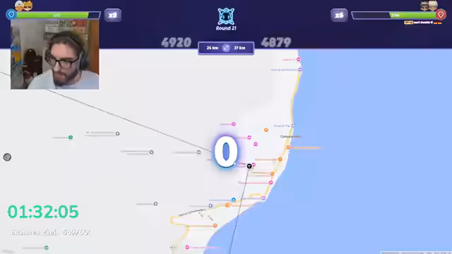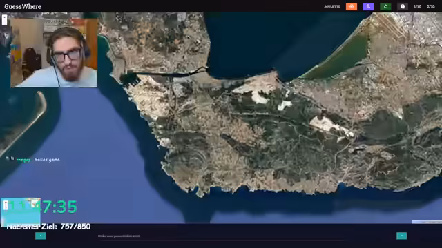 08:38:52Der Streamer hat erhebliche Schwierigkeiten, die Geoguessr-Runde korrekt zu lösen. Er verwechsitalienisch und spanische Orte und macht sich Sorgen, seine Punkte nicht zu verlieren. Die Treffernähe ist oft knapp, und er zögert lange, bevor er auf die Karte klickt, was die Verzögerung im Stream erhöht. Die Unzufriedenheit mit seiner eigenen Leistung ist deutlich hörbar.