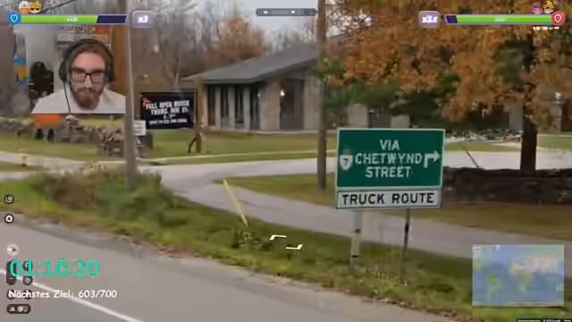01:58:56Der Stream beginnt mit einer Herausforderung, bei der eine virtuelle Fahrt durch Berlin unternommen wird. Ziel ist es, das Stadion an der alten Försterei zu finden. Der Spieler navigiert durch Berlins Straßennetz, fährt vom Moritzplatz über den Görlitzer Bahnhof, die Oberbaumbrücke und gelangt schließlich nach Köpenick, allerdings in die falsche Richtung. Nach einigen Verirrungen und Zurücksetzungen wird das Stadion auf einer Karte lokalisiert und die Challenge erfolgreich abgeschlossen.