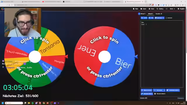 00:03:45Für das Frühstück ist eine ungewöhnliche Challenge geplant: Biermüsli. Um die Zutaten zu bestimmen, wird ein Wheel of Names mit Vorschlägen wie Bier, Energy-Drink, Milch, Wasser, Senf und Zitronensäure gefüllt. Es wird dreimal gedreht, wobei die ausgewählten Zutaten in das Müsli gegeben werden müssen. Nach drei Spins werden Milch, Energy-Drink und eine Art Waifu ausgewählt, was zu einer sehr gemischten und zum Teil unappetitlichen Frühstücksmischung führt.