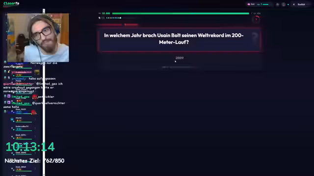 10:24:14Um die Interaktion zu fördern, startet der Streamer ein interaktives Geo-Quiz namens Geo-Connections. Mit einer großen Lobby von fast 64 Spielern werden verschiedene geografische und allgemeine Fragen beantwortet. Die Fragen reichen von Marathon-Weltrekorden bis hin zur Breite Australiens und sind für die Teilnehmer eine echte Herausforderung.