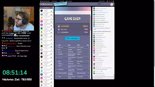13:02:12Nach Abschluss der Runde analysiert der Streamer das Spielprinzip und die Bandbreite der eingereichten Lieder. Er stellt fest, dass manche Wiederholungen stattfinden, während andere Songs völlig neu für ihn sind. Die Punktzahl der Teilnehmer wird als Indikator für die musikalische Kenntnis gesehen, und der Streamer reflektiert die enorme Bandbreite der von der Community vorgeschlagenen Stücke, von Chart-Hits bis Nischen-Musik.