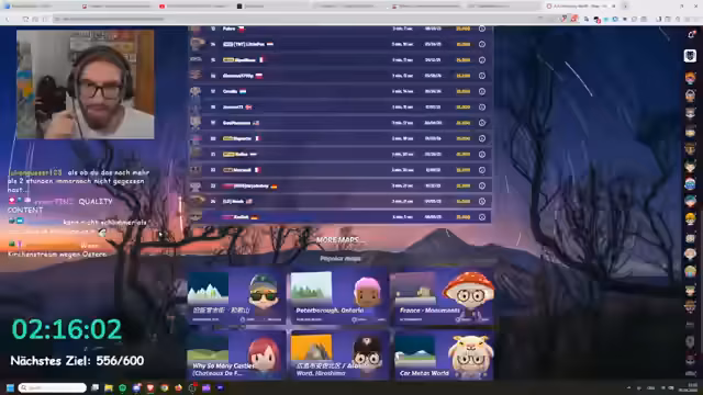 02:04:13Nach der Berlin-Challenge wechselt der Fokus zu verschiedenen Geoguessr-Speedruns. Es werden persönliche Bestzeiten (PBs) thematisiert und es gibt Versuche, unter vier Minuten zu bleiben. Es werden auch spezielle Herausforderungen wie die ACW (Autobahnbrücke Welt) Speedruns gespielt. Dabei kommt es zu schwierigen Runden, in denen die Pinpoints oft schwer zu finden sind, was zu unzufriedenen Kommentaren über das Movement und die Seed-Luck führt.