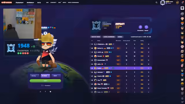 06:15:40Kodiar nutzt die Runde, um dem Chat geografische Details zu erklären, insbesondere zu Japan und der Unterscheidung von Regionen anhand von Dächern und Schneefall. Danach wechselt er das Spielformat und spielt mehrere 1v1-Duelle gegen Viewer im Modus 'NMPZ'. Er startet eine offene Einladung im Chat, sodass jeder teilnehmen kann. Die Runden variieren stark zwischen Nordamerika, Europa und Asien.