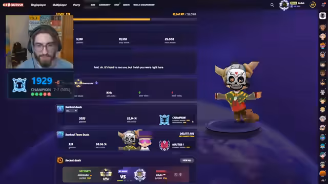 03:09:38Das Stream-Segment beginnt mit intensiven Regionenraten in The Race, wobei der Fokus auf Mexiko liegt, insbesondere auf den Regionen Zacatecas und Aguas Calientes. Der Streamer identifiziert durch Landschaftsmerkmale wie rote Böden und Kaktusgewächse die wahrscheinliche Position. Es kommt zu einem spannenden Duell gegen einen Gegner namens Tim, das knapp verloren geht, aber mit einem neuen Elo-Peak von 1997 belohnt wird. Das Spiel ist geprägt von rasanten Entscheidungen und der Jagd auf die 2000-Punkte-Marke.
