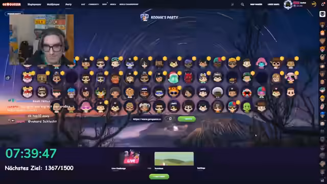 06:03:06Nachdem der Streamer wach und einsatzbereit ist, wird eine Geoguessr-Party-Session gestartet. Es werden Team-Duels angesetzt, und die Lobbygröße wird maximiert, um viele Spieler aufzunehmen. Der Modus wird auf 5 Sekunden pro Runde verkürzt, um die Spannung zu erhöhen. In der Lobby gibt es Verwirrung über die Teams und die Identifizierung von Spielern anhand ihrer Profilbilder. Die Session endet mit technischen Problemen in der Lobby, die zu einer Neuerstellung derselben mit erhöhter Rundenzeit führen.