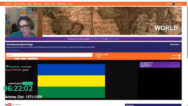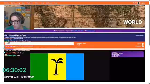 07:58:54Der Streamer wählt ein anspruchsvolles Quiz-Format aus: das Erraten der heutigen Länder anhand ihrer historischen Flaggen. Die Zuschauer sind eingeladen, gemeinsam mitzuraten und ihre Vermutungen im Chat zu teilen. Der Streamer versucht, die Flaggen zu identifizieren, stößt aber schnell auf seine Grenzen und gibt oft auf. Die Runde ist geprägt von Fehlversuchen und frustrierten Ausrufen. Der Streamer hat Schwierigkeiten, Flaggen zu identifizieren, die er nie zuvor gesehen hat, und bittet die Zuschauer um Ratschläge.
