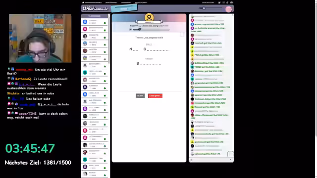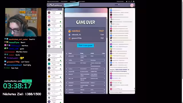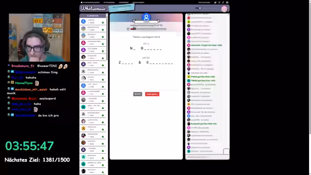 11:00:40Nachdem die "H"-Runde als sehr erfolgreich und gelungen empfunden wurde, entschied sich der Streamer für eine weitere Runde von "What's the Music". Da "P" und "H" bereits verwendet waren, wählte er den Buchstaben "N" als neues Thema. Die Runde gestaltete sich diesmal deutlich länger und aufwendiger, was den Streamer zwar aber auch beeindruckte. Er schätzte, dass die Runde mit 84 Teilnehmern startete und auf etwa 75 reduziert würde. Viele Lieder waren für ihn unbekannt und er brachte einige Titel mit hohen Punkten ein. Er kündigte an, sich kurz zurückzuziehen und versicherte, dass die Runde weitergehen würde.