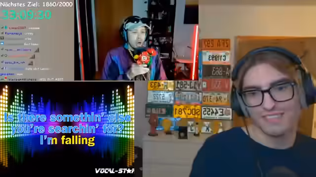 09:21:05Der Streamer macht spontan ein Duett mit einem Gastauftritt namens Akiro. Sie singen zusammen den Song 'Zündhölzli'. Dies erweist sich jedoch als technische und sprachliche Herausforderung, da der Streamer den Text des Schweizerdeutschen-Liedes nicht kennt. Die Synchronisation ist nicht perfekt und der Streamer hat Schwierigkeiten, die Zeilen rechtzeitig zu lesen. Dennoch findet er die Idee eines Duetts interessant und blicken in die Zukunft möglicher gemeinsamer Auftritte.