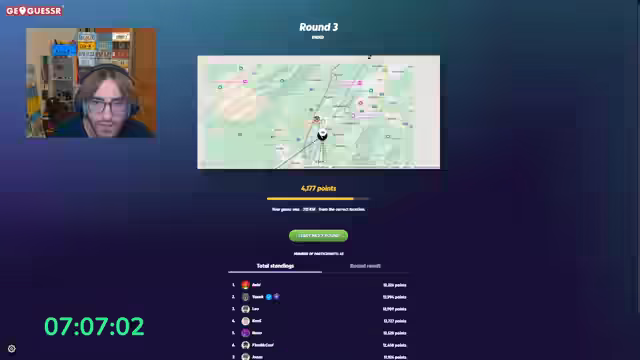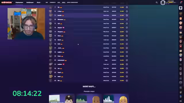 10:37:53Der Streamer erklärte die Skewed World Map, eine NRP-Setmap, bei der man immer von der Straße wegschaut und sich auf Landschaft und Vegetation konzentriert. Er startete eine Runde und kommentierte die hügelige Landschaft in Schweden, die er zunächst falsch einschätzte. Eine weitere Runde in Kanada, die er zunächst falsch einschätzte, wurde schließlich korrekt identifiziert. Eine Runde in Bulgarien, die er zunächst falsch einschätzte, wurde schließlich korrekt identifiziert. Eine weitere Runde in der Slowakei, die er zunächst falsch einschätzte, wurde schließlich korrekt identifiziert. Er lobte das Training vom Vortag, das sich ausgezahlt hatte. Er startete eine weitere Runde in Backseeing World, einer No-Move-Map mit Bergen. Er erklärte, dass man auf dieser Map viel über Zuckerrohr in Japan lernen könne, insbesondere auf den südlichen Inseln wie Okinawa und Miyakojima. Er erwähnte, dass Radu als Nächstes dran sei und er sich darauf freue, seinen Run anzuschauen. Eine weitere Runde in Backseeing World führte zu einem wunderschönen Berg in Rondonia, Brasilien. Eine Runde in Irland, die er zunächst falsch einschätzte, wurde schließlich korrekt identifiziert. Eine Runde in Deutschland, die er zunächst falsch einschätzte, wurde schließlich korrekt identifiziert. Eine Runde in Vietnam, die er zunächst falsch einschätzte, wurde schließlich korrekt identifiziert. Eine weitere Runde in Vietnam, die er zunächst falsch einschätzte, wurde schließlich korrekt identifiziert. Eine Runde im Libanon, die er zunächst falsch einschätzte, wurde schließlich korrekt identifiziert. Eine Runde in China, die er zunächst falsch einschätzte, wurde schließlich korrekt identifiziert. Eine Runde in Serbien, die er zunächst falsch einschätzte, wurde schließlich korrekt identifiziert. Eine weitere Runde in Norwegen, die er zunächst falsch einschätzte, wurde schließlich korrekt identifiziert. Eine Runde in Vietnam, die er zunächst falsch einschätzte, wurde schließlich korrekt identifiziert. Er überlegte, ob er eine weitere Runde Backseeing World spielen sollte, da er darauf Lust hatte. Er stellte fest, dass Radus Run noch eine halbe Stunde dauern würde und entschied sich, noch eine Runde zu spielen, bevor er sich den Run anschaute.