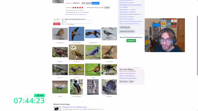 06:56:34Der Streamer stellt sich einem 'Heimische Vögel-Bilder-Quiz', das sich als überraschend schwierig erweist. Er versucht, Vögel wie Rotkehlchen, Bussard, Uhu und Fasan zu identifizieren, muss aber oft auf die Hilfe des Chats zurückgreifen, um seltenere Arten wie Rauchschwalbe, Bachstelze, Habicht oder Lachmöwe zu erkennen. Die Herausforderung liegt in der genauen Bestimmung der Vogelarten, da viele Ähnlichkeiten aufweisen. Anschließend wechselt er zu einem Quiz über die 'Zehn größten europäischen Länder nach Fläche'. Er listet Länder wie Russland, Ukraine, Schweden, Frankreich, Deutschland, Italien und Spanien auf und ergänzt Polen, um die Liste zu vervollständigen. Diese Quizze bieten eine unterhaltsame Abwechslung und zeigen die Bandbreite der Interessen des Streamers und seiner Community.