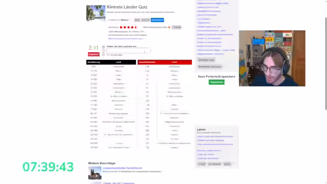 06:45:16Der Streamer setzt seine Quiz-Session mit einem 'Deutschland Allgemeinwissen'-Quiz fort. Er beantwortet Fragen zu deutschen Dichtern, Flüssen, Gebäuden und Persönlichkeiten wie Goethe, Elbe, Schloss Bellevue und Max Planck. Trotz einiger kniffliger Fragen, wie nach dem höchsten Hochhaus Deutschlands oder dem Verfassungsorgan, das die Länder in der Gesetzgebung mitwirken lässt, erreicht er eine 100%-Quote und zeigt sein umfassendes Wissen. Anschließend wagt er sich an ein Quiz über 'Länder mit Hinweis über Grenzen gehen', bei dem er Länder anhand von geografischen Merkmalen und historischen Ereignissen identifizieren muss, wie zum Beispiel Länder am Mittelmeer oder solche, die an den Beringsee grenzen. Auch hier beweist er seine Geografiekenntnisse, auch wenn er bei einigen Ländern wie den Malediven überrascht ist, dass sie zu den kleinsten Ländern der Welt zählen.