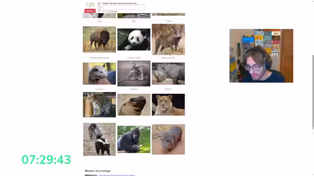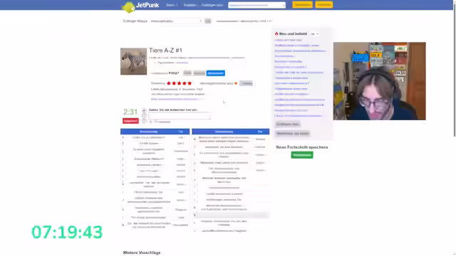 07:18:09Das Spiel geht weiter mit einem Quiz, bei dem Farben nach Anfangsbuchstaben benannt werden müssen. Hierbei stellen sich Buchstaben wie 'E' und 'O' als besonders schwierig heraus, was zu lustigen und kreativen Vorschlägen im Chat führt, wie 'Eierschale' oder 'Orientrot'. Nach dieser Herausforderung widmen sie sich einem Tier-Quiz von A bis Z, bei dem Tiere wie Aal, Biber, Chamäleon und Dingo genannt werden. Besonders amüsant ist die Verwechslung von 'lachendes Tier' mit 'laxendes Tier', was für Heiterkeit sorgt. Anschließend wird eine Pause eingelegt, um Videos anzuschauen, während der Streamer etwas essen möchte.