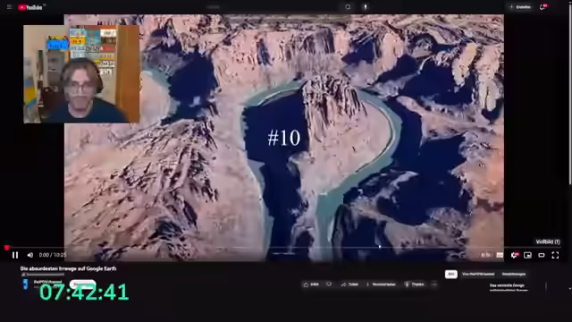 07:26:12Der Streamer sucht nach unterhaltsamen Videos und stößt auf den 'POV-Channel', einen Kanal, der sich auf Geografie-Themen und die Erkundung von Street View und Google Earth spezialisiert hat. Er zeigt sich begeistert von den coolen Geografie-Sachen und den Entdeckungen von Fels- und Bergformationen. Besonders beeindruckt ist er von einem Video, in dem der YouTuber eine einzigartige geologische Formation aus achteckigen Basaltsäulen in einer abgelegenen Gegend des Landes erkundet. Die Videos des Kanals, die oft von einem Hund begleitet werden, zeigen aufwendige Touren zu faszinierenden Naturphänomenen in den Western US, wie Canyons und Felsformationen. Die Community im Chat ist ebenfalls fasziniert von den Inhalten und den beeindruckenden Landschaften.