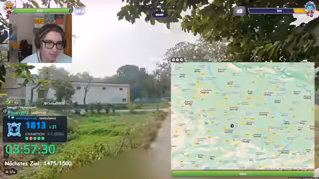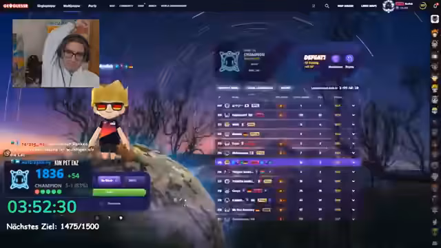 06:32:44Nach den allgemeinen Quizrunden wechselt der Stream zu Geoguessr, einem Geo-Rätselspiel. Ein Haupthighlight ist die Kooperation mit Wayfinder, einem als sehr gut geltenden Spieler des Spiels, der für ein 2v2-Match eingeladen wird. Kodiak und Wayfinder treten gegen andere Teams an, wie Miko und weitere Gegner. Es geht um hohe Elo-Rankings und strategisches Vorgehen auf den Landkarten, wobei es auch zu technischen Problemen und Missverständnissen bei den Ortsbestimmungen kommt.