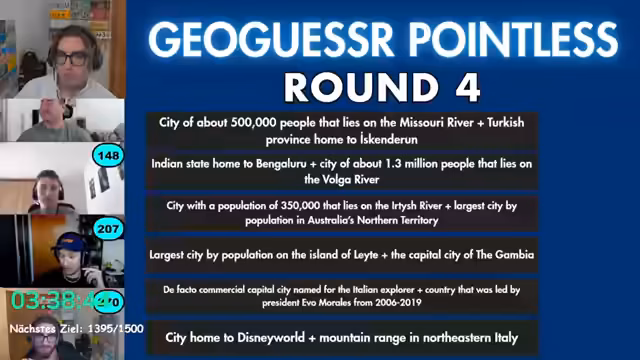10:17:23Nach einer Reihe von erfolgreichen Geoguessr-Runden, bei denen unter anderem der Eiffelturf und eine australische Stadt erkannt werden, schlägt der Streamer eine Pause vor, um bei einem Geo-Quiz mit Basti und Lennli auszuruhen. Anschließend werden wieder verschiedene Kategorien gespielt. Bei einer Flaggen-Runde wird ein Fehler in der Flagge von Tuvalu korrigiert, und bei einer Sprachen-Runde muss Portugiesisch erkannt werden. Die Teilnehmer diskutieren über die Schwierigkeit und die Quellenangaben der Fragen.