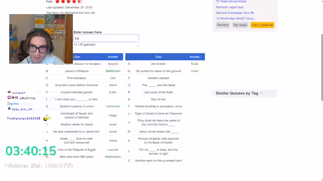 06:01:15Nach mehreren Runden Closer2 entscheidet sich der Streamer für eine Runde Jetpunk. Das Quiz konzentriert sich auf verschiedene Kategorien, darunter Musik, die Bibel und Beatles-Knowledge. Er testet sein Wissen über die Beatles und singt einige Lieder, während er versucht, verschiedene Fakten über die Band zu beantworten.