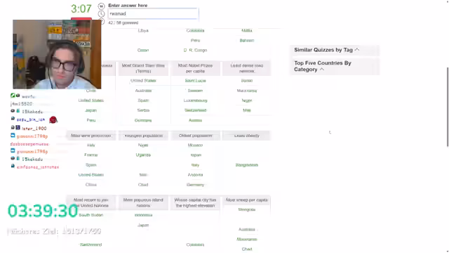 05:08:39Nach mehreren Runden Geoguesser wechselt der Streamer zu dem Quizspiel Closer2. Er erläutert die Spielweise und pinnnt den Link zum Spiel in den Chat. Es folgen mehrere Fragen mit unterschiedlichen Themenbereichen wie Geografie, Popkultur, Wissenschaft und Geschichte. Der Streamer kämpft mit einigen Antworten, ist aber oft unsicher über die Richtigkeit.