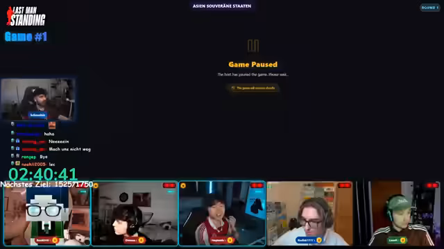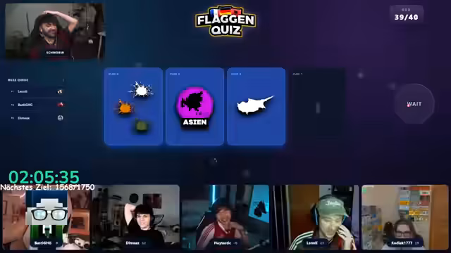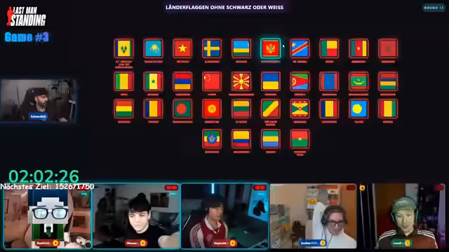 13:02:37In der letzten Flaggen-Runde kämpfen die Teilnehmer um die letzten Punkte. Die Stimmung ist angespannt, da sie wissen, dass dies das Ende der Quiz-Runde ist. Einige finden es schwierig, die letzten Flaggen zu identifizieren, während andere, wie Basti und Hui, Schwierigkeiten haben, rechtzeitig zu reagieren. Nach der letzten Flagge folgt die Auswertung und die endgültige Rangliste der Spieler.