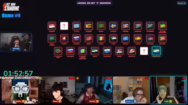 09:05:42Das Spiel wechselt nun zu einem Geografie-Quiz, bei dem die Teams Länder mit Anfangsbuchstaben raten müssen. Die Liste umfasst die 193 Mitgliedstaaten der Vereinten Nationen. Das Team um Basti, Dima und Wayne beginnt mit Schweden und folgt einem alphabetischen Vorgehen. Es entstehen Diskussionen über die korrekte Schreibweise und Aufzählung von Ländern, insbesondere bei Fällen wie Südkorea und die Schweiz, wobei Sprachbarrieren und politische Umstände eine Rolle spielen.