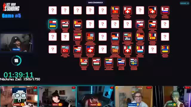 12:28:19Der Stream wechselt nun zu einem Flaggen-Quiz. Der Moderator erklärt die neuen Regeln: Es gibt vier Hinweise (Farben, Kontinent, Umriss, die vollständige Flagge), und je früher ein Spieler buzzert, desto mehr Punkte gibt es. Die Teilnehmer spielen als Einzelpersönlichkeiten, teilen sich aber einen gemeinsamen Punktepool. Das Spiel setzt sofort mit der ersten Flagge ein und fordert schnelles Wissen über Farbschemata und Kontinente.