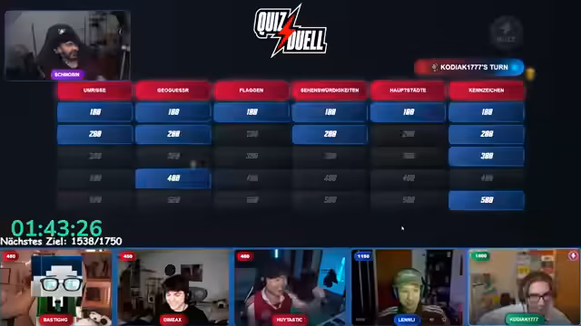 09:43:09Ein neues Quizduell beginnt, bei dem die Teams sich abwechselnd verschiedene Geografie-Kategorien wie Flaggen, Hauptstädte, Umrisse und Sehenswürdigkeiten für unterschiedliche Punktwerte (100-500 Punkte) aussuchen. Jeder falsche Antwort führt zur Halbierung der Punkte, während andere Teams nachbuzzer können. Die Teilnehmer taktisch geschickt, wobei sich die Experten auf anspruchsvollere Aufgaben wie Geoguessr oder Flaggen 500 konzentrieren, während durchschnittlichere Spieler leichtere Kategorien wie Hauptstädte 200 bevorzugen.