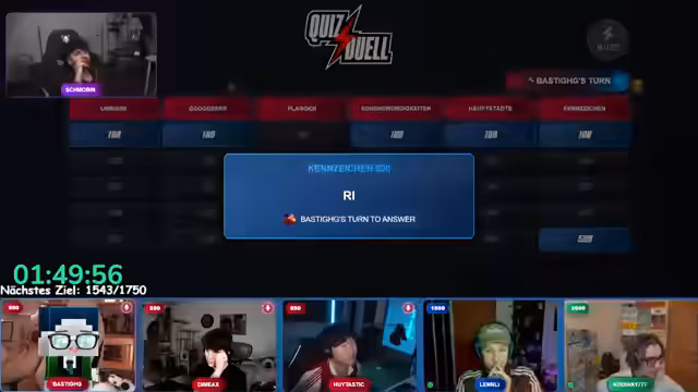 08:10:15Der Streamer begrüßt Hui im Video-Chat, um das bevorstehende Geografie-Quiz zu besprechen. Das Format wird als '1 gegen 1 gegen 3' erklärt, wobei der Streamer und Lenly alleine spielen und Basti, Dima und Hui als Team antreten. Bevor es losgeht, wird die technische Einrichtung einer virtuellen Kamera via OBS besprochen, um die Teilnehmer in den Stream einzubinden. Alle Teilnehmer sind bereits live in ihren jeweiligen Cams zu sehen, um das Quiz vorzubereiten. Es herrscht eine lockere und gespannte Atmosphäre.